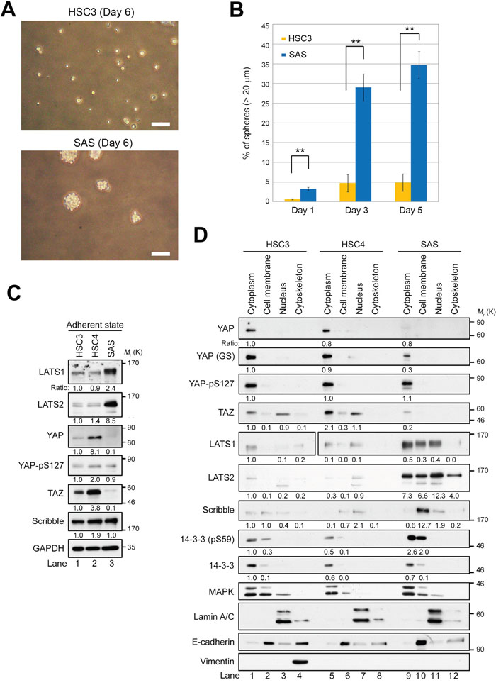 Figure 1: LATS1/2 are overexpressed and YAP/TAZ are downregulated in SAS cells in the adherent state. (A) Phase contrast images of spheres from HSC3 (top) and SAS (bottom) cell lines seeded at 400 cells/cm2 in 100 mm low-adhesion sphere culture dishes and grown for 6 days. Scale bars represent 100 μm. (B) Quantification of sphere-forming ability of HSC3 (orange bars) and SAS (blue bars) cells. Bar graphs show the percentages of spheres (> 20 μm diameter) among total cells (HSC3, > 200 cells; SAS, > 170 cells). (C) Western blot analysis of the indicated Hippo pathway regulators in HSC3, HSC4, and SAS cells growing under adherent culture conditions. GAPDH was used as a loading control. The levels of the indicated proteins were normalized against the level of GAPDH. Expression patterns of other proteins, including α-tubulin, were shown in Supplementary Figure 1C. (D) HSC3, HSC4, and SAS cells were cultured under adherent conditions and fractionated into cytoplasm, cell membrane, nucleus, and cytoskeleton, followed by western blotting with the indicated antibodies. YAP and YAP (GS) are monoclonal (clone H-9) and polyclonal antibodies, respectively. 14-3-3 and MAPK are cytoplasmic markers; Lamin A/C is a nuclear marker; and E-cadherin is a cell membrane marker. Another cytoskeleton marker, vimentin, was detected only in the cytoskeleton fraction of HSC3, suggesting that HSC4 and SAS cells might retain epithelial properties.