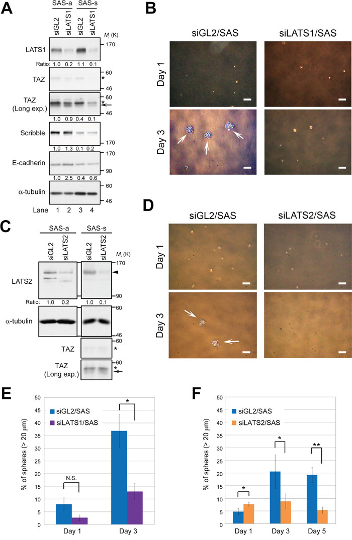To determine whether LATS1/2 are important factors for sphere formation in CSCs, we knocked down endogenous LATS1 or LATS2 using siRNA in SAS cells, and then grew the cells for one more day under conventional adherent culture conditions (termed “SAS-a” for “attached SAS”; Figure 2A, lanes 1 and 2) or in sphere-forming conditions without serum (termed “SAS-s” for “spheres”; Figure 2A, lanes 3 and 4). The level of LATS1 was elevated, whereas the level of Scribble was reduced, in SAS-s in comparison with SAS-a (Figure 2A, lanes 3 and 4). Expression of TAZ in SAS cells was very low (Figure 1C), and could not be detected unless the western blot exposure time was lengthened (Figure 2A, second and third panels from top); in any event, TAZ levels did not differ between the two conditions. Importantly, depletion of LATS1 inhibited sphere formation by SAS cells, whereas negative control cells (siGL2/SAS) formed spheres normally (Figure 2B). As with LATS1, knockdown of LATS2 also inhibited sphere formation by SAS cells (Figure 2C, 2D). Notably, depletion of LATS1 or LATS2 did not promote drastic accumulation of TAZ in SAS-a or SAS-s, although the active (non-phosphorylated) form of TAZ was slightly more abundant in LATS-knockdown cells (arrows in Figure 2A, 2C). To confirm the importance of LATS kinases in initiation of sphere formation, we measured the frequency of primary spheres > 20 μm in diameter in LATS1/2-depleted (siLATS1/SAS and siLATS2/SAS) and control SAS cells (siGL2/SAS). As expected, siLATS1/SAS and siLATS2/SAS suppressed sphere formation (frequency of spheres, ~5–10%), whereas siGL2/SAS generated a larger number of spheres after day 1 (20–40%) (Figure 2E, 2F). Double knockdown of LATS1/2 also suppressed the sphere formation (~15%), although the synergistic effect of LATS1 and LATS2 kinases was not observed in this assay (Supplementary Figure 1D, 1E). Furthermore, we confirmed that double knockdown of LATS1/2 suppressed sphere formation by another OSCC cell line, SCC-4 (Supplementary Figure 1F, 1G, 1H); however, unlike SAS cells, TAZ was detectably expressed in adherent SCC-4 cells (Supplementary Figure 1F, third panel from top). These results suggest that the LATS1/2 are required for self-renewal of CSCs, especially in the early initiation phase of sphere formation.