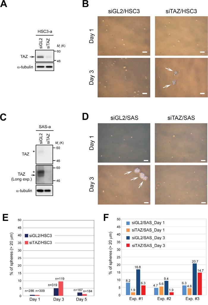 Figure 3: Downregulation of TAZ is insufficient to promote sphere formation in HSC3 cells. (A) HSC3 cells were transfected with TAZ siRNA (siTAZ) and siGL2, and cultured for 3 days under adherent culture conditions (HSC3-a). Cell lysates were subjected to western blotting with the indicated antibodies. Arrow indicates TAZ. α-tubulin was used as a loading control. (B) Representative phase contrast images of TAZ-depleted (siTAZ/HSC3) and control HSC3 (siGL2/HSC3) cells, grown under sphere formation conditions, on days 1 and 3. White arrows indicate spheres. Scale bars represent 100 μm. (C) SAS cells were transfected with siTAZ and siGL2, and cultured as in A. Cell lysates were subjected to western blotting with the indicated antibodies. A long-exposure image of TAZ protein (Long exp.) is shown in the second panel; TAZ was expressed at a low level in SAS cells (see also Figure 1C). Asterisks and arrow show phosphorylated and non-phosphorylated (active) forms of TAZ, respectively. α-tubulin was used as a loading control. (D) Representative phase contrast images of TAZ-depleted (siTAZ/SAS) and siGL2/SAS cells. Images were obtained as in B. White arrows indicate spheres. Scale bars represent 100 μm. (E) Frequency of sphere formation in siTAZ/HSC3 (reddish orange bars) and siGL2/HSC3 (dark blue bars) cells, grown under sphere formation conditions, on days 1, 3, and 5. Numbers (n) above bar graphs represent total cell count, including spheres. (F) Frequency of sphere formation in siTAZ/SAS (orange and red bars) and siGL2/SAS (light blue and dark blue bars) cells, grown under sphere formation conditions, on days 1 and 3. More than 200 cells were counted on day 1, and more than 180 cells were counted on day 3. Data from three independent experiments (Exp. #1–#3) were shown by each bar graph. Numbers above bar graphs represent percentage of spheres.