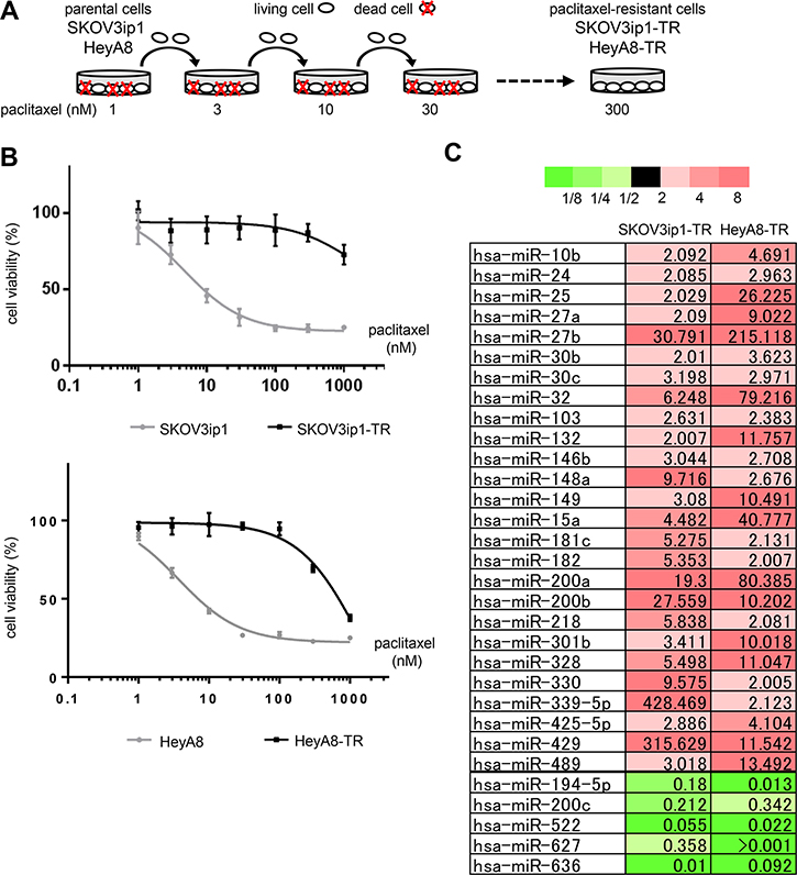 First, we established paclitaxel-resistant ovarian cancer cell lines from two different high-grade serous ovarian cancer cell lines, SKOV3ip1 and HeyA8, by repeated exposure to stepwise increases of paclitaxel (Figure 1A). The two established sublines, named SKOV3ip1-TR and HeyA8-TR, respectively, showed higher IC50 values for paclitaxel (SKOV3ip1-TR: > 1000 nM, HeyA8-TR: 647 nM) than their parental cells (SKOV3ip1: 4.76 nM, HeyA8: 3.74 nM) (Figure 1B).