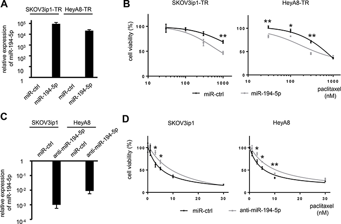 Figure 2: miR-194-5p modulates sensitivity to paclitaxel in ovarian cancer cell lines. (A) miRNA qRT-PCR. Cells were transfected with pre-miR-194-5p (miR-194-5p) or control miR (miR-ctrl). Twenty-four hours later, expression of miR-194-5p relative to RNU6B expression was calculated using the 2-ΔΔCT method. Relative fold differences are presented. (B) MTS assay. Twenty-four hours after transfection with miR-194-5p or control miR-ctrl, cells were treated with paclitaxel for 72 hours and cell viability was assessed. Cell viability is shown relative to that in paclitaxel-free conditions. (C) miRNA qRT-PCR. Cells were transfected with anti-miR-194-5p or miR-ctrl for 24 hours. (D) MTS assay. As described in B, cells were transfected with anti-miR-194 or miR-ctrl and cell viability was assessed. Experiments were performed in triplicate. Data are represented as mean ± SE and are obtained from three independent experiments. *P < 0.05; **P < 0.01.