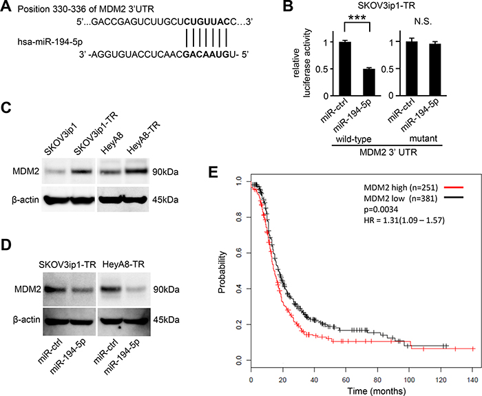 Figure 3: MDM2 is a direct target gene of miR-194-5p and is upregulated in paclitaxel-resistant cells. (A) Schematic illustration of predicted the MDM2 3′-UTR-binding site of miR-194-5p. (B) Luciferase reporter assay. SKOV3ip1-TR cells were co-transfected with miRNA precursor (miR-194-5p or miR-ctrl), luciferase reporter vector containing wildtype or mutant 3′-UTR of MDM2, and Renilla luciferase control vector. Twenty-four hours after incubation, luciferase activity normalized to Renilla activity was measured. Experiments were performed in triplicate. Data are represented as mean ± SE and are obtained from three independent experiments. ***P < 0.001; n.s., not significant. (C and D) Western blot. MDM2 expression between parental cell lines and paclitaxel-resistant sublines (C). After cells were transfected with miR-194-5p or miR-ctrl for 24 hours, cell lysates were collected and MDM2 expression was evaluated. β-actin was used as a loading control. Blots are representative of three experiments (D). (E) Kaplan-Meier survival analysis. Kaplan Meier Plotter database indicated that high MDM2 expression in ovarian cancer patients treated with paclitaxel (n = 632) correlates with poor progression-free survival (P = 0.0034).