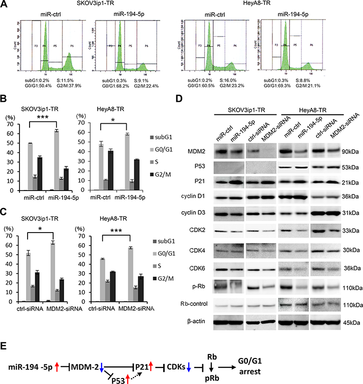 Figure 5: miR-194-5p and its target MDM2 induce G0/G1 cell cycle arrest. (A–C) Cell cycle analyses. Paclitaxel-resistant cells transfected with miRNA precursors (miR-194-5p or ctrl-miR) or siRNAs (MDM2-siRNA or ctrl-siRNA) were stained with propidium iodide and analyzed by flow cytometry. Representative flow histograms. P3 = subG1 phase. P4 = G0/G1 phrase. P5 = S phase. P6 = G2/M phase (A). Percentage of cells in subG1, G0/G1, S, and G2/M phase. Paclitaxel-resistant cells transfected with miRNA precursors (B) or siRNAs (C). Data are represented as mean ± SE and are obtained from three independent experiments. (D) Western blot (left, SKOV3ip1-TR cells; right, HeyA8-TR cells). Expression of MDM2 and cell cycle-related proteins in paclitaxel-resistant cells transfected with miRNA precursors or siRNAs. Blots are representative of three experiments. (E) Schematic diagram of the pathway downstream of miR-194-5p. *P < 0.05, ***P < 0.001.