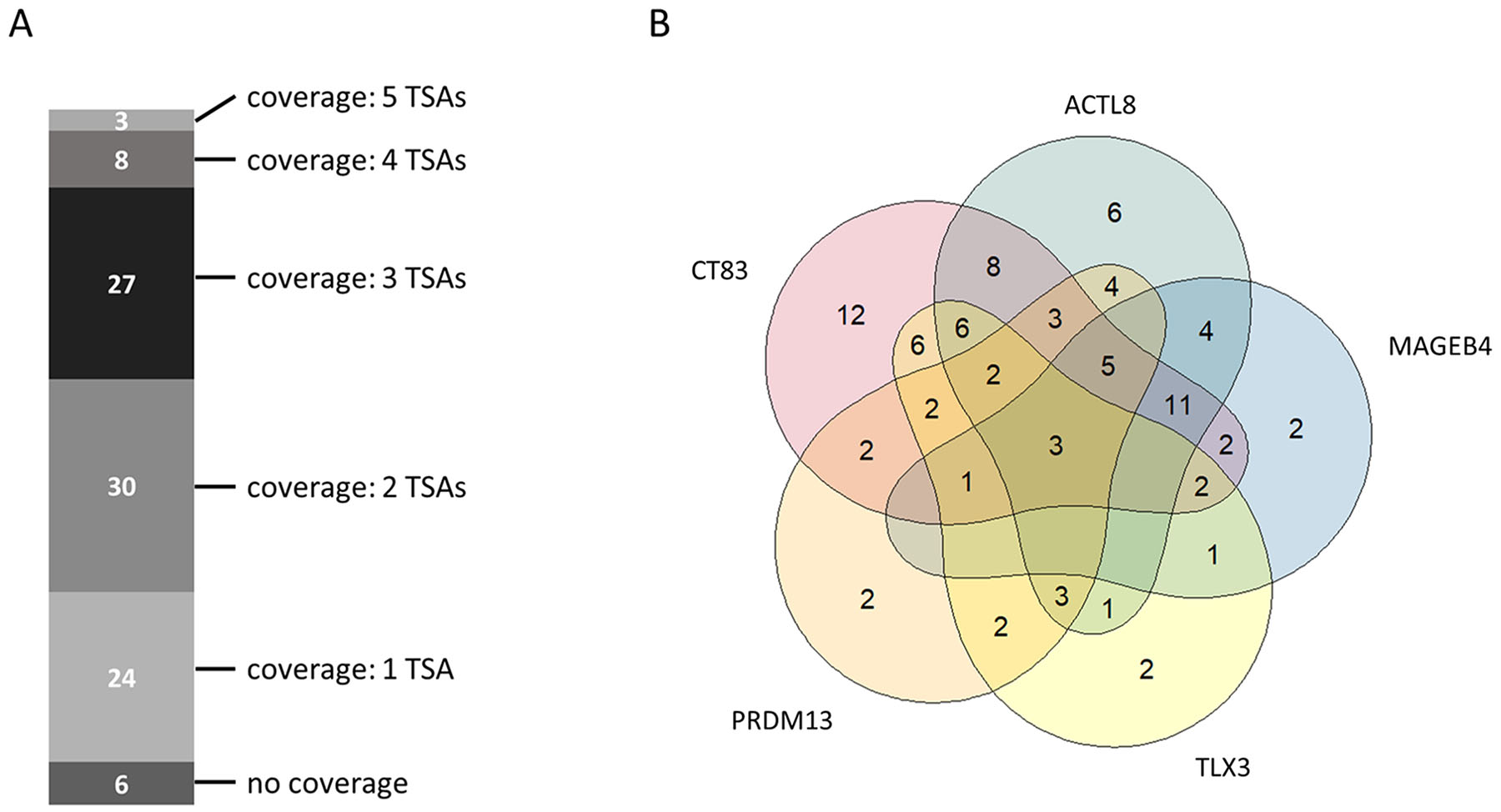 For the 480 potential TSAs identified in the first step, genes were ordered according to digital target prioritization factor (DTPF). The prioritized top-15 protein-coding TSAs are listed in Table 1. Each gene is listed along with the average expression value in tumor samples, the number of TNBC samples in which the gene is highly expressed (coverage), the number of PPAEs and the DTPF. The calculated DTPF ranges from 1.499 for tumor-specific antigen CT83 (ranked 1st) to 1.153 for DMRT1 (ranked 15th). The coverage for the top-15 TSAs range from 17 TNBC samples for C4orf51 (ranked 13th) up to 65 TNBC samples for CT83 (ranked 1st). The highest average expression values, calculated across all cancer samples, have candidate tumor-specific antigens ACTL8 (ranked 2nd), MAGEA6 (ranked 14th) and C6orf15 (ranked 8th) with a normalized count expression of 2167.8, 981.4 and 787.0 respectively. Most of the top-15 identified TSAs have two PPAEs (7 targets), including the top-2 ranked genes CT83 and ACTL8 in the list. Five of the top-15 candidate TSAs have even less than two PPAEs (MAGEB4, TLX3, PRDM13, ERVV-2, and C4orf51). Only three of the top-15 list have more than three PPAEs (OBP2B (5), CLPSL1 (5), and MIA (4)).