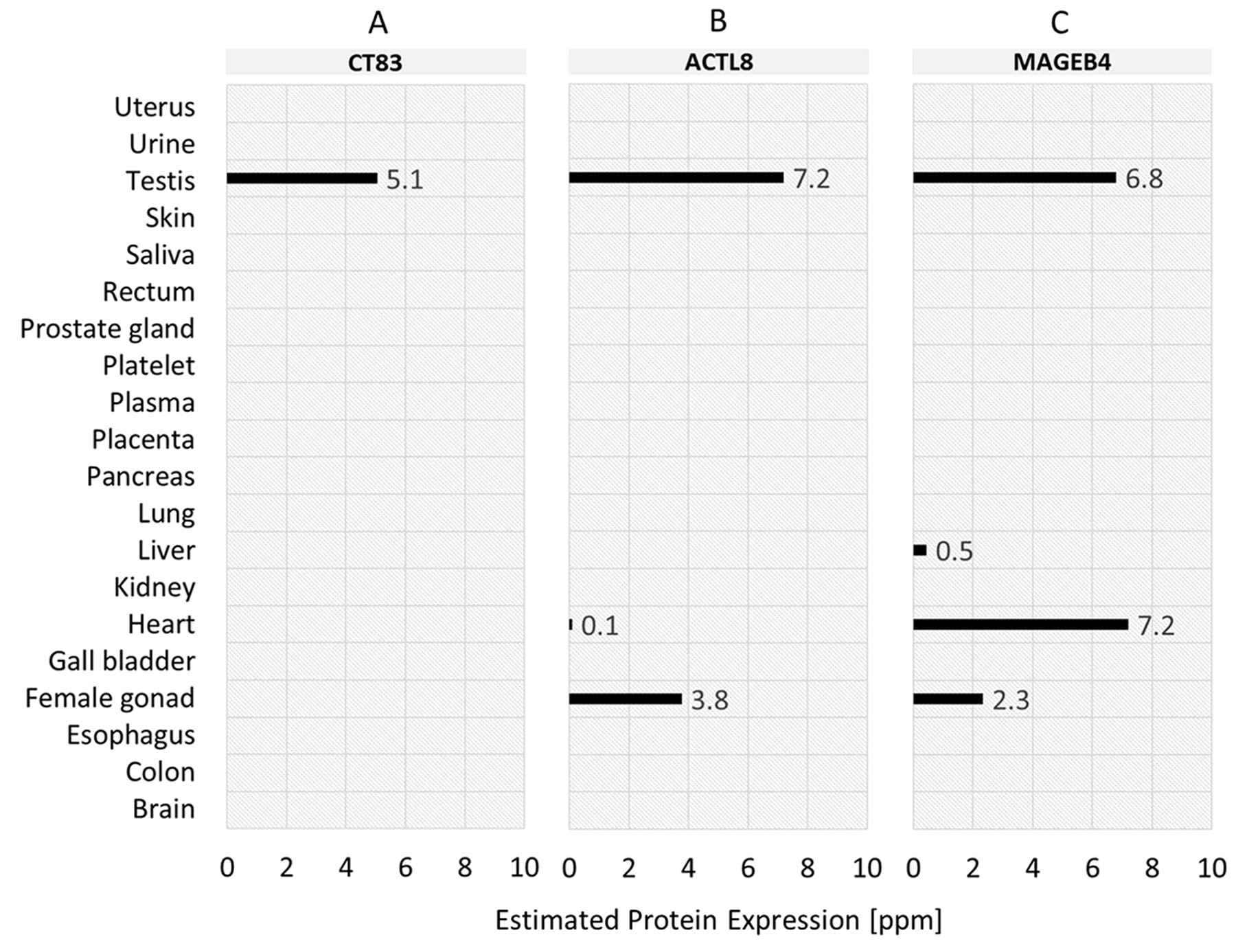 Protein expression values for top ranked tumor-specific antigens were obtained from PaxDB [45]. PaxDB is a comprehensive absolute protein abundance database, providing integrated datasets, which aggregate and average protein expressions over the various samples, conditions and cell-types resulting in high coverage and data quality. All protein abundances are given in ppm, which is short for parts per million. After identification of tumor-specific antigens with highest DTPF, protein expression data for the top-3 ranked TSAs were selected and downloaded as.tsv file from PaxDB. Afterwards, the downloaded file was filtered only for integrated datasets, resulting in average protein expression values for 20 different normal tissues (brain, colon, esophagus, female gonad, gall bladder, heart, kidney, liver, lung, pancreas, placenta, plasma, platelet, prostate gland, rectum, saliva, skin, testis, urine, uterus).