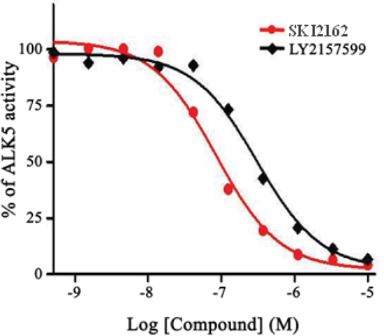 Figure 1: Concentration-dependent effects of SKI2162 on ALK5 inhibition. The inhibition of ALK5 activity by SKI2162 and LY2157299 was tested using purified recombinant ALK5. Different concentrations of each test compound were used and percent-activity values were calculated to derive the corresponding IC50 values. The calculated IC50 values for SKI2162 and LY2157299 were 0.094 μM and 0.327 μM, respectively.