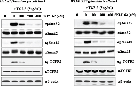 Activation of Smad2 and Smad3 by TGF-β1 is directly inhibited by SKI2162 in keratinocyte and fibroblast cells