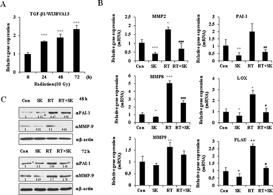 Figure 3: SKI2162 (SK), an inhibitor of ALK5, suppressed radiation-induced fibrosis (RIF)-related genes. (A) The mRNA expression of TGF-β1 induced by radiation in the fibroblast cell lines (***p < 0.001 vs. 0 hour). (B) Reduced gene expression level of RIF-related markers by SKI2162 (*p < 0.05, **p < 0.01, and ***p < 0.001 vs. control, #p < 0.05, ##p < 0.01, ###p < 0.001 vs. RT). (C) Reduced induction of the RIF-related proteins (PAI-1 and MMP9) by SKI2162.