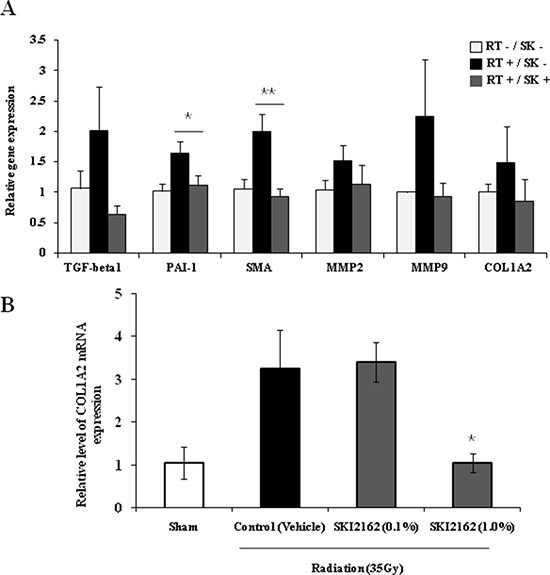 Figure 5: SKI2162 (SK) suppressed fibrosis-induced target genes in the radiation-induced fibrosis (RIF) mouse model. (A) Real-time PCR showed that RIF-related markers were inhibited by SKI2162 (*p < 0.05, **p < 0.01 vs. RT+/SK−). (B) Topical administration of SKI2162 (1.0%) significantly repressed the induction of COL1A2 mRNA in a RIF mouse model (*p < 0.05 vs. control).