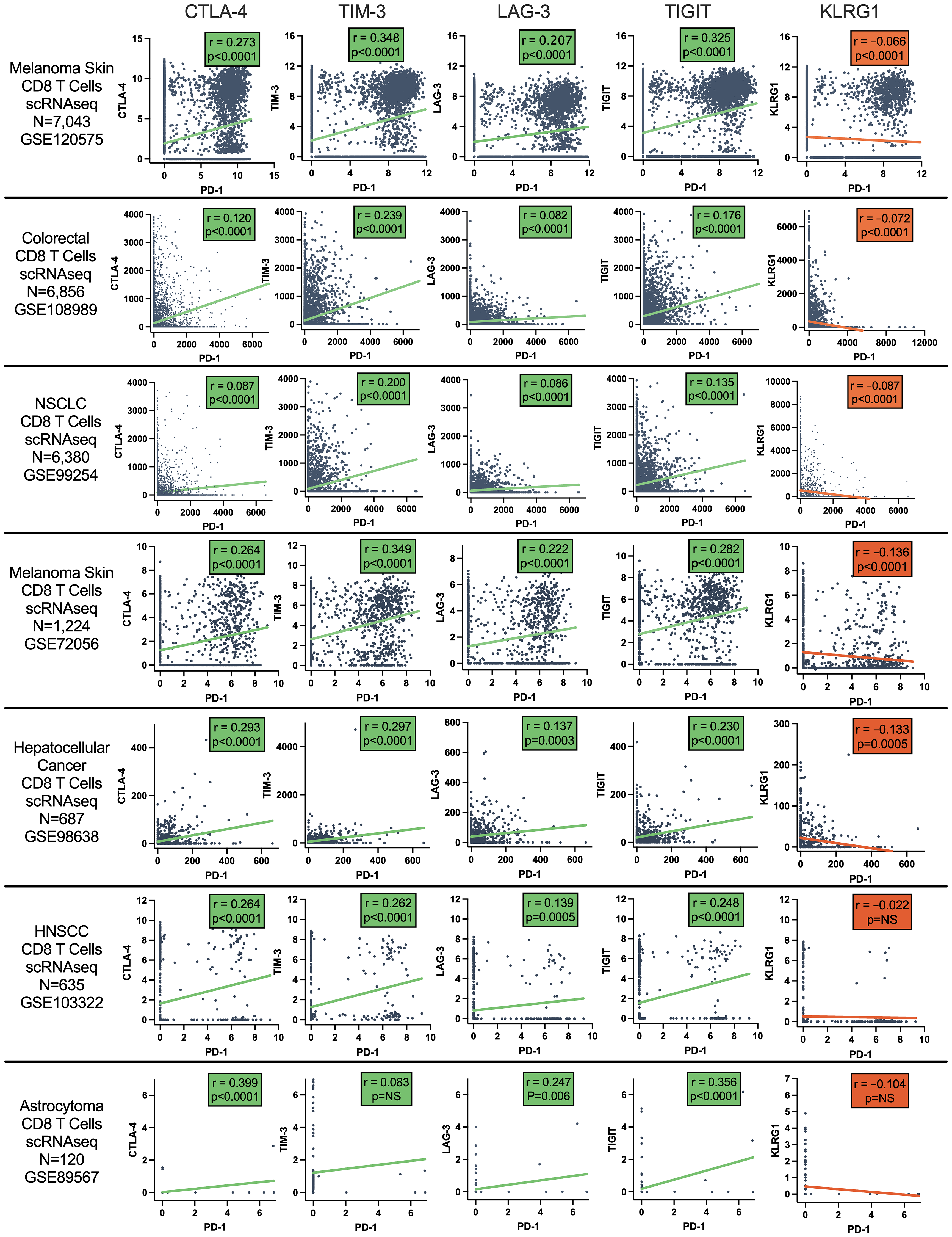 Public domain RNAseq gene expression data of bulk immune cell populations in normal blood (GSE107011) [25] was analyzed for pairwise Pearson correlation of PD-1 (PDCD1) with other T cell inhibitory receptors across the differentiated T cell subsets CD4 TEMRA, CD8 TEM (T effector memory) and TEMRA (effector), and γδ T cells, and in lung cancer tumor infiltrating lymphocytes (TILS) from dataset GSE99531. Correlation analysis was performed of single cell RNAseq gene expression from cancer tissue datasets used in a previously published analysis [10] including GSE72046 (melanoma) [26], GSE98638 (HCC) [27], GSE103322 (HNSCC) [28], and GSE89567 (astrocytoma) [29] and newly analyzed comprehensive datasets GSE120575 (melanoma) [30], GSE108989 (colorectal cancer) [31], and GSE99254 (non-small cell lung cancer) [32]. CD8 T cells were annotated as those T cells with non-zero expression of CD8A. Published graphical data was abstracted using https://apps.automeris.io/wpd/.