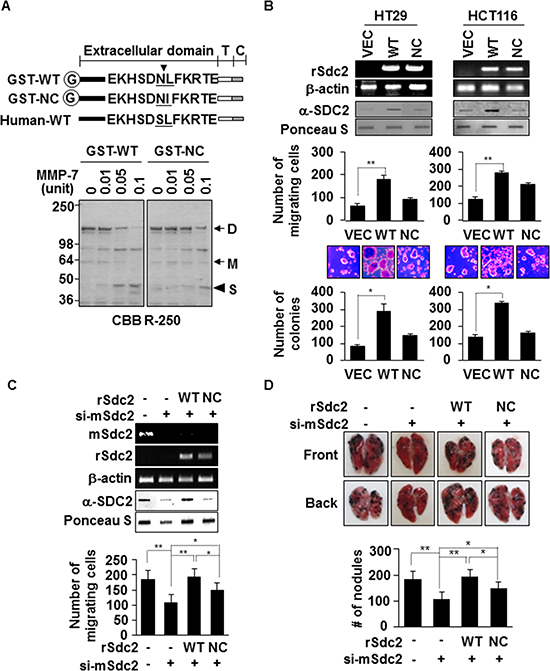 Figure 1: Extracellular domain shedding is necessary for syndecan-2 functions in colon cancer. (A) Equivalent amounts of GST-fused rat syndecan-2 wild-type (WT) or the Leu149® Ile non-cleavable mutant (NC) were incubated with pro-MMP-7, separated by SDS-PAGE, and stained with Coomassie Brilliant Blue. The arrows indicate the dimeric (D) and monomeric (M) forms of syndecan-2. The arrowhead indicates the shed fragment of syndecan-2 (S). (B) Colon cancer cells were transfected with 1 μg of VEC, WT- or NC-syndecan-2. Syndecan-2 mRNA expression was evaluated by RT-PCR using the indicated primer. Conditioned medium was subjected to slot blotting with the anti-syndecan-2 antibody (top). Transfected cells were allowed to migrate on gelatin-coated (10 μg/ml) Transwell plates, and migrated cells were stained with hematoxylin and eosin, and counted (middle). n = 3; **p < 0.01. Transfected cells were added to bottom agar and colonies were counted after 2 weeks (bottom). n = 5; *p < 0.05. (C) B16F10 cells were transfected with siRNA targeting mouse syndecan-2 alone or with 1 μg of the indicated rat syndecan-2 constructs. Syndecan-2 mRNA expression, shed syndecan-2 in the conditioned media and cell migration were analyzed as described in Figure 1B. n = 5; **p < 0.01, *p < 0.05. (D) BALB/c mice were injected with the indicated B16F10 melanoma cells. After 2 weeks, lungs were removed and examined. Two independent experiments were performed (n = 5/each group). Representative photographs of the front and back sides of each lung are shown (top). The bar graph indicates the numbers of metastatic lung nodules (bottom). The columns represent the mean (± s.d.) number of lung metastatic nodules (n = 3). *p < 0.05, **p < 0.01.