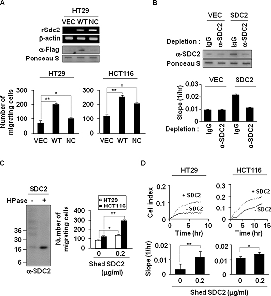 Figure 2: Shedding of syndecan-2 plays a critical role in colon cancer cell migration. (A) HT29 cells were transfected with indicated cDNAs, and syndecan-2 mRNA expression was evaluated by RT-PCR. Conditioned media were subjected to slot blotting with the anti-Flag antibody (top). HT29 and HCT116 cells were treated with HT29 conditioned media (final 10% v/v) from VEC, WT- or NC-syndecan-2 mutant transfected cells and allowed to migrate on Transwell apparatus (bottom). n = 5; *p < 0.05, **p < 0.01. (B) Conditioned media were immunodepleted with control IgG- or anti-syndecan-2 antibody-conjugated protein G beads. The supernatants were subjected to slot blotting with anti-syndecan-2 antibody (top). Mixture of HCT116 cells with each supernatant (final 10% v/v) were added to the upper chambers of CIM-plates and migration curves were monitored using the xCELLigence system. The rates of cell migration over 24 hr were analyzed using the RTCA software to each RTCA CIM-Plate wells (bottom). (C) Shed syndecan-2 in HT29 cell conditioned media was isolated by DEAE-Sepharose column chromatography. Final elution fractions were digested by heparinase and analyzed by immunoblotting using anti-syndecan-2 antibody (left). Cells were treated with 0.2 μg/ml of purified shed syndecan-2, and Transwell migration assay was performed (right). n = 5; *p = 0.05, **p < 0.01. (D) Cells were treated with 0.2 μg/ml of purified shed syndecan-2, and a real-time migration assay was analyzed by xCELLigence system. n = 5; *p = 0.05, **p < 0.01.