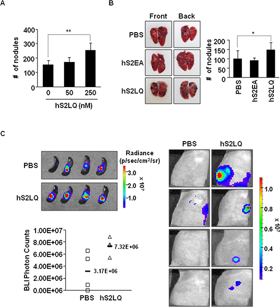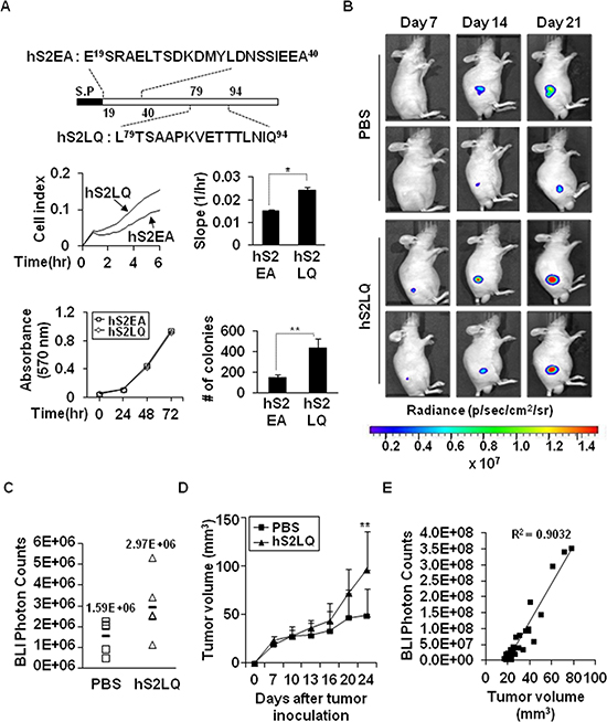 We next constructed a series of recombinant deletion mutants of shed syndecan-2, a C-terminal deletion mutant, N2E-Fc, and an N-terminal deletion mutant, C2E-Fc of shed syndecan-2, expressed each in HEK293T cells, and collected the conditioned media. Treatment of HCT116 cells with the conditioned media containing C2E-Fc caused a remarkable increase in migration and anchorage-independent growth of HCT116 cells (Supplementary Figure S5A–S5C). When we further constructed a C2E-Fc deletion mutant, N-terminus residues 89–104 (L89TSAAPEVETMTLKTQ104, C2EQ104-Fc), the conditioned media from the C2EQ104-Fc-expressing cells enhanced migration of HCT116 cells (Supplementary Figure S5D), suggesting that the tumorigenic activity of shed syndecan-2 resides in the C-terminus of the extracellular domain. Expectedly, treatment of HCT116 cells with synthetic peptides corresponding to human sequence (hS2LQ) caused a remarkable increase in cell migration compared with the control peptide (hS2EA), without affecting cell proliferation (Figure 3A). In addition, hS2LQ-treated HCT116 cells showed a sharper increase in colony number following growth in soft agarose, compared to hS2EA-treated cells (Figure 3A). To further investigate the effect of syndecan-2 peptide on colon cancer cell primary growth, luciferase-expressing human colon cancer cells were subcutaneously injected into 6-week-old male BALB/c nude mice, and tumors were monitored and measured starting 7 days post injection for up to 21 days. Subcutaneous images showed an increase in photon emission from the tumor sites in syndecan-2 peptide treated mice compared with PBS treated control mice (Figure 3B and 3C). Moreover, mice given a syndecan-2 peptide developed more rapidly growing tumors than the PBS-treated mice (Figure 3D). There was a positive correlation between tumor weights and photon count (Figure 3E, R2 = 0.9032).