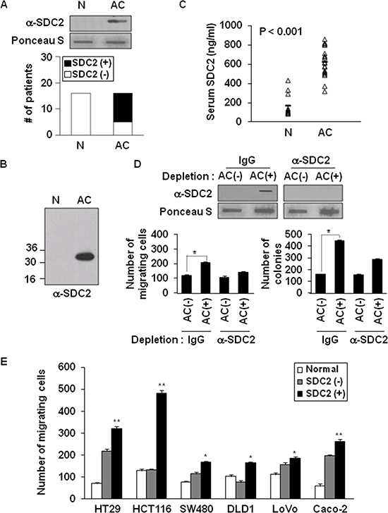 Figure 5: Elevated levels of shed syndecan-2 in serum correlate with increased migratory potential in colon cancer. (A) Serum samples from either a normal donor (N) or advanced stages of colon cancer (AC) patients were subjected to slot blotting with anti-syndecan-2 antibody. The data represent the number of patients found to be serum negative (□) or serum positive (■) for the presence of shed syndecan-2. (B) Serum samples pretreated with HNO2 were resolved by 15% SDS-PAGE followed by blotting with the anti-syndecan-2 antibody. (C) Serum from patients with colon cancer (n = 12) and normal controls (n = 11) was analyzed by ELISA for shed syndecan-2 levels. Median levels are indicated by the horizontal bars. (D) Serum samples from shed syndecan-2 negative (AC-) and positive (AC+) AC patients were incubated with protein A Sepharose, and then the unbound materials were further immunodepleted with either IgG- or anti-syndecan-2 antibody-conjugated protein G Sepharose. The supernatants were subjected to slot blotting with the anti-syndecan-2 antibody (top). The supernatants were then used for Transwell migration assays and anchorage-independent growth assays with HCT116 cells (bottom). n = 4; *p < 0.05. (E) Colon cancer cells were treated with the indicated serum samples and allowed to migrate on gelatin-coated Transwell plates. n = 4; *p < 0.05, **p < 0.01.
