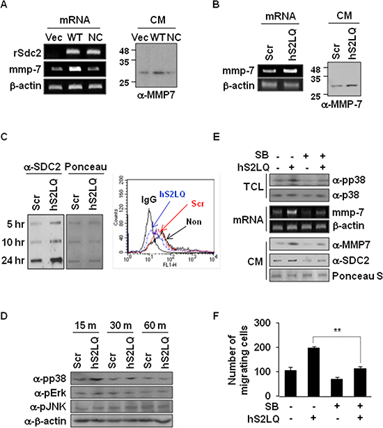 Figure 6: Shed syndecan-2 enhances MMP-7 expression via p38 MAP kinase activation in colon cancer cells. (A) HT29 cells were transfected with indicated cDNAs. Expression of SDC2 and MMP-7 was analyzed by RT-PCR (left). Conditioned media (CM) were collected, and proteins were concentrated by TCA precipitation and analyzed by immunoblotting using anti-MMP-7 antibody (right). (B) HT29 cells were treated with either scrambled (Scr) or human (hS2LQ) peptide in SFM for 24 hr, and MMP7 expressions were analyzed by RT-PCR (left). Conditioned media were collected, and proteins were concentrated by TCA precipitation and analyzed by immunoblotting using anti-MMP-7 antibody (right). (C) HT29 cells stably overexpressing syndecan-2 were treated with the indicated peptides and conditioned media were subjected to slot blotting with the anti-syndecan-2 antibody (left). Cells were either untreated (non) or treated with the indicated peptides and cell surface expression of syndecan-2 was analyzed by Flow cytometry (right). (D) HT29 cells treated with the indicated peptides were lysed, and MAPK activation was assessed using an antibody specific for phospho-p38 (pp38). (E) HT29 cells preincubated with SB239063 (1 hr) were treated with the syndecan-2 synthetic peptide. After 15 min, total cell lysates (TCL) were subjected to immunoblotting with the indicated antibodies to determine the phosphorylation of p38 (top). At 6 hr, MMP-7 mRNA expression was analyzed by RT-PCR (middle), and conditioned media were subjected to either immunoblotting with anti-MMP-7 antibody or slot blotting with anti-syndecan-2 antibody (bottom). (F) HT29 cells preincubated with SB239063 (1 hr) were allowed to migrate on Transwell apparatus in the absence or presence of the syndecans-2 peptide. n = 4; **p < 0.01.