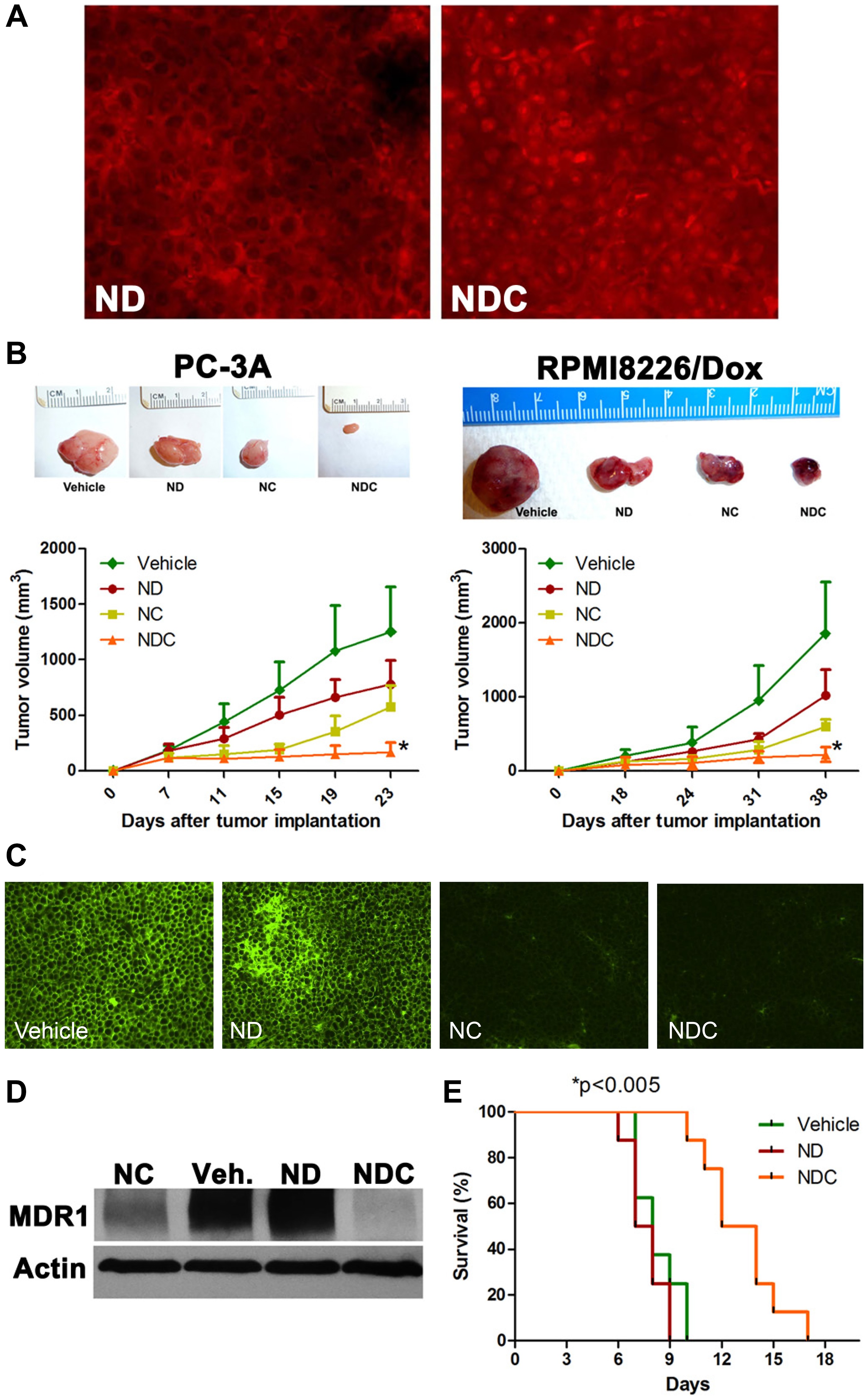 Figure 2: NDC overcomes DOX resistance in vivo. (A) Representative tumor sections from RPMI8226/Dox xenografts were examined by fluorescence microscopy for nuclear accumulation of DOX by doxorubicin fluorescence. (B) NDC significantly inhibits the growth of subcutaneous DOX-resistant cancer xenografts PC-3A and RPMI8226/Dox. Representative excised xenograft tumors from each of the four arms are illustrated. NDC significantly blocked tumor growth compared to either ND or NC (N = 5, *p < 0.005). Post treatment levels of MDR1 expression were measured by (C) immunofluorescence and (D) western blot in RPMI8226/Dox xenografts. (E) BDF1 mice bearing P388/ADR DOX-resistant ascites were treated with vehicle, ND, or NDC. A greater than 50% increase in survival was observed in NDC treated mice compared to ND or vehicle treated mice (N = 8, *p < 0.005).