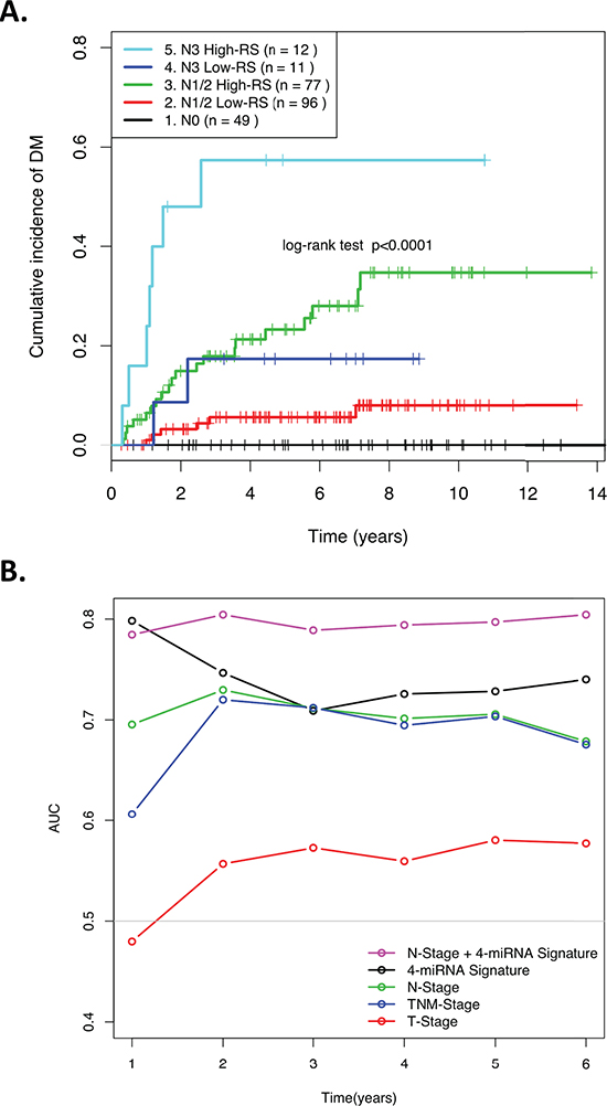 Multivariate analysis was performed by including the 4-miRNA signature risk-group assignment (“high risk” or “low risk”) for each patient adjusted with clinical variables (T-Stage, N-Stage, gender, age, treatment) in a CoxPH model fitted to the combined Training and Validation datasets (n = 242; one patient removed due to unevaluable nodal stage, three patients removed due to unevaluable tumour stage). The two variables observed to be significantly associated with DM in this model (the 4-miRNA signature RS, and N-stage) were then combined to create five risk groups: 1. N0; 2. N1/2 & Low-RS; 3. N1/2 & High-RS; 4. N3 & Low-RS; and 5. N3 & High-RS. The area-under the curve (AUC) was calculated for the receiver operating characteristic (ROC) curves across multiple time points using the ‘survivalROC’ package (v1.0.3) [41] and the C-statistics for various predictive models were calculated using the ‘survConcordance’ function in the ‘survival’ package (v2.37–4) [42] for R. A depiction of the signature generation and validation workflow is depicted in (Figure S6).