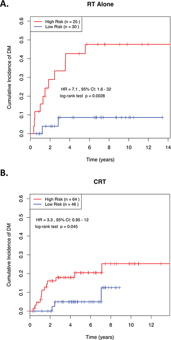 Figure 3 demonstrates the ability of this 4-miRNA signature to predict risk of DM in advanced stage (III & IV) patients who were treated with RT alone (HR = 7.13; p = 0.003; Figure 3A), as well as those who were treated with CRT (HR = 3.35; p = 0.045; Figure 3B). These data suggest that even in NPC patients with locally-advanced disease, this 4-miRNA signature could potentially identify a low-risk group of patients, whose likelihood of developing DM at 5-years was so low (<10%), that adding CT to their RT might have no benefit to their survival (Figure 3A). Conversely, there remained a high-risk group, whose outcome could be potentially improved with the administration of combined CRT, since RT alone was associated with a 5-year risk of 45% in developing DM (Figure 3A), vs. 20% when treated with CRT (Figure 3B).