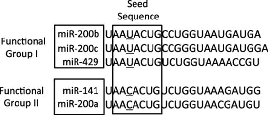 Figure 2: The sequences of the mature miRNA-200 family members. The miR-200 family members can also be separated into two functional groups based upon their seed sequences. Functional Group I is composed of miR-200b, -200c, and -429 and Functional Group II consists of miR-141 and -200a. The seed sequences of these two functional groups only differs by one nucleotide: AAUACUG for group I and AACACUG for group II.