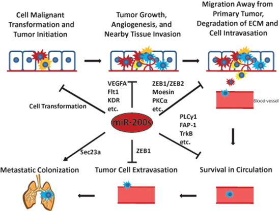 Current research on the miR-200 family has shown that the family can affect each step of the metastatic cascade. Therefore, this section will summarize these works in respect to the order of each metastatic step as described above.