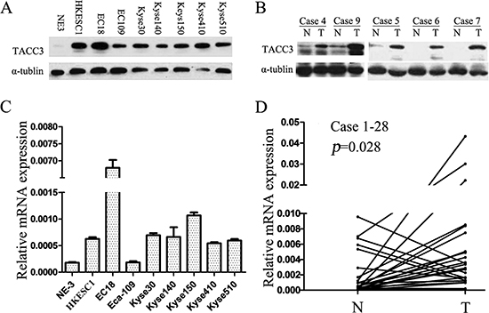 To investigate the TACC3 expression in ESCC, qRT-PCR and western blotting were performed in both an immortalized normal human esophageal epithelial cell line, NE3, and a panel of ESCC cell lines including Eca-109, EC18, HKESC1, KYSE30, KYSE140, KYSE150, KYSE410, and KYSE510, respectively. TACC3 expression was barely detectable in NE3, whereas a notably higher level of TACC3 expression was showed in most of ESCC cell lines except Eca109, a well differentiated ESCC cell line (Figure 1A and 1C). Furthermore, we performed qRT-PCR and western blotting in 28 pairs of matched ESCC tissue and adjacent noncancerous tissue to examine whether the high expression of TACC3 occurred in ESCC patients. The protein expression of TACC3 in the tumor tissues was mostly higher than those paired adjacent normal samples (Figure 1B). Consistently, the expression level of TACC3 in ESCC tissues is significantly higher than the level in matched normal tissues by quantitative analysis (Figure 1D). In conclusion, TACC3 was frequently upregulated in both ESCC cell lines and tissues.