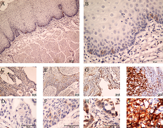 Figure 2: Expression of TACC3 in ESCC tissues by immunohistochemistry staining. (A and B) negative TACC3 staining in normal esophageal epithelium tissue (negative control) (A) 100×, (B) 400×; (C and D) negative staining of TACC3 in ESCC tissue (C) 100×, (D) 400×; (E and F) weak staining of TACC3 in cytoplasm (E) 100×, (F) 400×; (G and H) moderate staining of TACC3 in cytoplasm (G) 100×, (H) 400×; (I and J) strong staining of TACC3 in cytoplasm (I) 100×, (J) 400×.