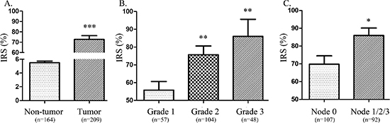 Each section was independently evaluated by two pathologists who were blinded to the clinical status of the patients. The biomarker was evaluated according to staining intensity scored as (0, negative staining; 1, weak staining; 2, moderate staining; 3, strong staining) and the extent of staining scored as the percentage of positive cells. The final immunoreactivity score (IRS) is the product of intensity score and the extent score.