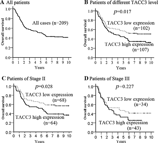 Of the 209 patients in this study, the median follow-up period was 5.2 years (range, 0.3 to 10 years), with 121 cancer-related deaths at the final clinical follow-up. The 5-year overall survival rate was 50.7% for the total study population (Figure 4A). In the Kaplan–Meier analysis, OS was longer for patients with low TACC3 expression than those with high TACC3 expression (p = 0.017, median 6.0 vs. 3.7 years, Figure 4B). Further stratification of patient groups based on stage displayed that the correlation of low TACC3 expression and longer OS was statistically significant in Stage I–II patients with ESCC (p = 0.028, median 7.1 vs. 6.0 years, Figure 4C). However, in Stage III, there was no significant association between low TACC3 expression and longer OS (p = 0.227, median 1.9 vs. 1.6 years, Figure 4D).