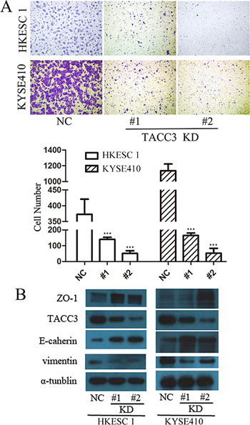 Figure 6: TACC3 silencing inhibited ESCC cell migration. (A) Transwell assay of HKESC1 and KYSE410 cells transfected with NS or TACC3-targeting (KD) siRNAs. Data represent means ± SD. Data presented as means ± SD (***p < 0.001). (B) Western blot lysates from HKESC1 and KYSE410 cells transfected with NS or TACC3-targeting (KD) siRNAs, with α.-tublin as an internal control.