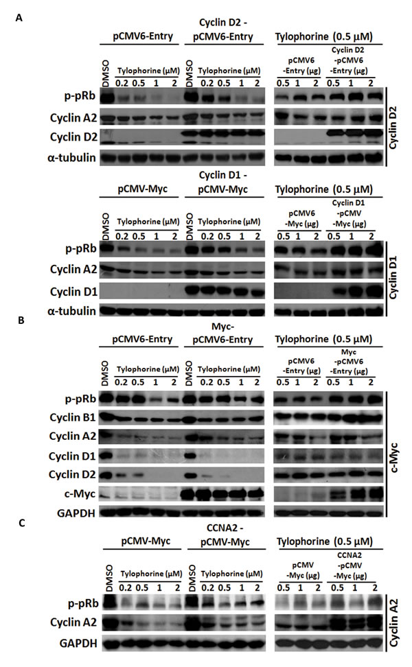 Figure 4: Gain-of-function experiments for tylophorine-induced decreased protein expression of cyclin D1, cyclin D2, and c-Myc. A. Ectopically overexpressed cyclin D1 or D2 restored the hyperphosphorylation of pRb and the expression of cyclin A2. B. Ectopically overexpressed c-Myc rescued the biological function of its downstream effectors (e.g., cyclin B1 and p-pRb) but not the protein expression of cyclin D1 and D2. C. Ectopically overexpressed cyclin A2 moderately restored the hyperphosphorylation of pRb. HONE-1 cells were transfected with the indicated expression vectors for 24 h prior to treatment with either vehicle (DMSO) or tylophorine at the indicated concentrations for an additional 24 h. The resulting cell lysates were analyzed by western blotting with the indicated antibodies. The relative expression or phosphorylation levels of each protein were normalized with their respective internal loading control α-tubulin or GAPDH. The results shown are representative of 3 independent experiments.