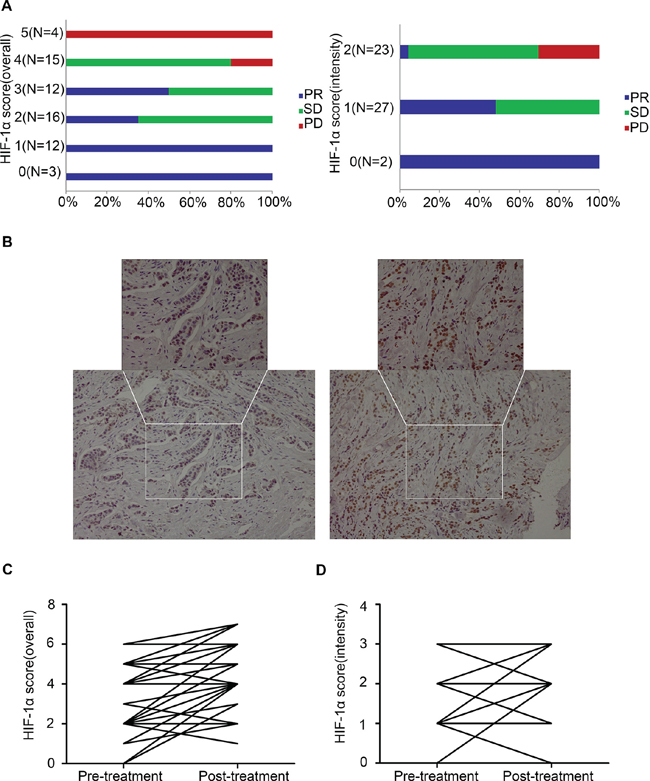 In the subset of 52 patients, HIF-1α expression levels before and after treatment were compared based on IHC analysis (Figure 1B). The HIF-1α expression level in the post-treatment samples was significantly increased compared with that at baseline, regardless of the scoring methods applied (overall score or intensity score, p < 0.0001 or p = 0.0002, respectively; Paired t-test), and such changes were also consistent regardless of the response types: partial response (PRs), stable disease (SDs) or progressive disease (PDs) (Figure 1C, 1D).
