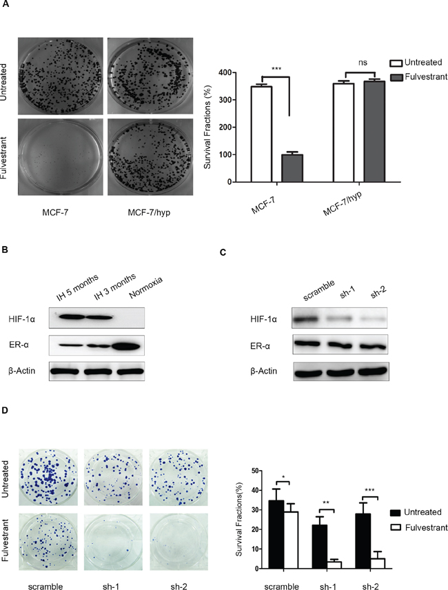 Figure 4: Knockdown of HIF-1α expression in intermittent hypoxic cells sensitizes breast cancer cells to fulvestrant. (A) MCF-7/hyp cells formed significantly more colonies than did wild-type MCF-7 cells after anti-estrogen fulvestrant treatment; (B) Western blot analysis showed activation of HIF-1α expression and maintenance of ERα expression in MCF-7/hyp cells, even after their return to a normoxic environment; (C) MCF-7-hyp cell lines stably expressing two different shRNAs targeting HIF-1α (sh-1 and sh-2) and the control cell line with scramble shRNA (scramble) were established. Western blot analysis showed expression of HIF-1α was significantly down-regulated in sh-1 and sh-2 cell lines; (D) Cell proliferation was inhibited more significantly by fulvestrant in sh-1 and sh-2 cell lines (p < 0.0001 and p = 0.0001 respectively) compared with the scramble control.
