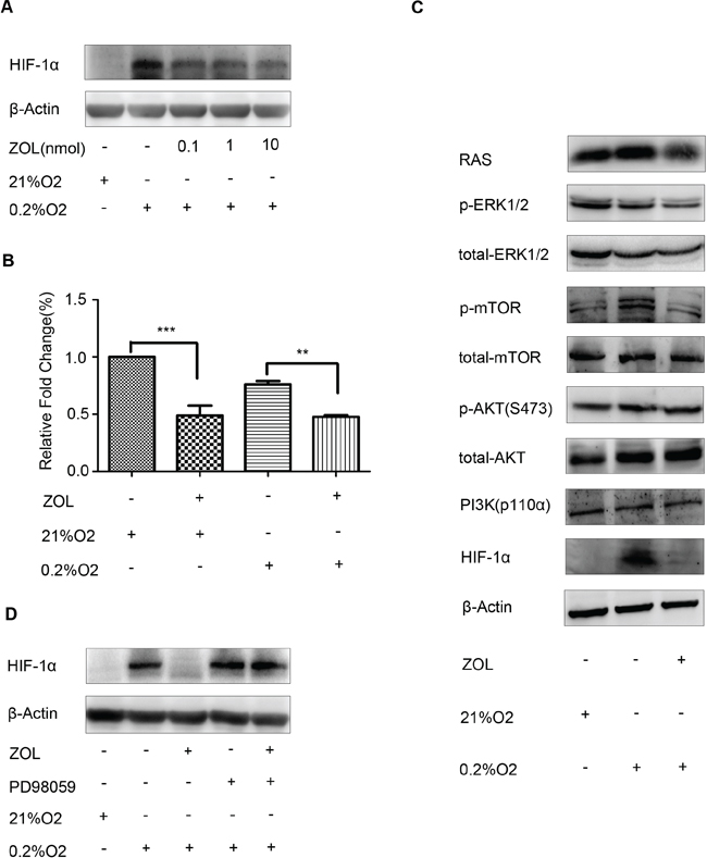 Previous studies have shown that HIF-1α is activated in a RAS-dependent manner [18], and that the PI3K/Akt and ERK1/2 signaling pathways are involved in HIF-1α protein expression [19]. To elucidate the mechanism by which zoledronic acid inhibits HIF-1α expression, we next examined the effect of zoledronic acid on the activity of RAS-dependent signaling pathways. Interestingly, we found that zoledronic acid significantly reduced phosphorylated-ERK1/2 levels, but had no obvious effects on phosphorylated-AKT and PI3K (p110α) levels (Figure 5C). When pre-treat with PD98059, a specific inhibitor of ERK1/2, zoledronic acid showed no obvious effects on HIF-1α protein expression (Figure 5D). Our results indicate that zoledronic acid inhibited HIF-1α expression, at least in part, through the RAS/MAPK/ERK1/2 signaling pathway.