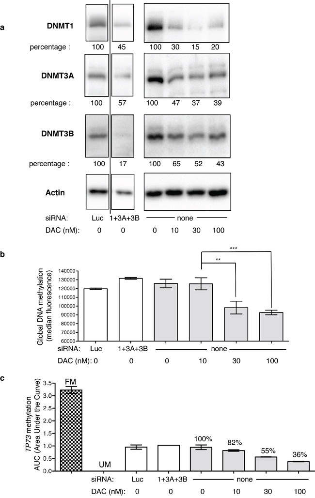 Figure 1: Impact of DNMT downregulation on global DNA methylation and TP73 promoter methylation. (a) Western blot of DNMT1, 3A and 3B in KG1 cells treated with the combination of siRNAs directed against DNMT1 (100 nM), DNMT3A (300 nM) and DNMT3B (300 nM), compared to siRNA directed against luciferase (Luc, at 700 nM)), and to a dose range of DAC (10, 30 and 100 nM). Actin protein was revealed on the same membranes and used to normalize for loading variations. The bands shown in the first quadrants (siRNA treated cells) have been cropped and come from the same gel (the full gels are accessible in Supplementary Figure S2). The relative percentages for each DNMT protein in response to the treatments are indicated (in %) and are the mean values of two independent experiments. The image shown is representative of one of these two. (b) The same cells were analyzed for total DNA methylation by flow cytometry (white bars cells treated with siRNA, gray bars cells treated with DAC). P-value: ** ≤ 0.01 and *** ≤ 0.001. (c) TP73 promoter region methylation was assessed by MS-HRM analysis. The areas under the curves are reported for siRNA treated cells (white bars) and DAC-treated cells (gray bars). FM, fully methylated DNA control, UM, unmethylated DNA control.