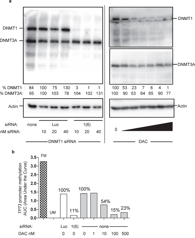 Figure 2: Impact of extensive DNMT1 depletion in HCT116 cells on TP73 promoter methylation. HCT116 human colon cancer cells have been transfected every two days for four days with the same DNMT1 siRNA (1(6)) used in KG1 cells, or exposed for 72 hours to a dose range of DAC (0, 0.001, 0.01, 0.03, 0.1, 1, 10 μM). (a) Two days after the first transfection, total proteins were extracted and subjected to Western blotting with DNMT1 and DNMT3A antibodies. Actin was used as loading control. The percentages of residual DNMT protein levels are indicated relative to the corresponding untreated controls normalized to 100% (b) Four days post-transfection DNA was extracted and subjected to MS-HRM analysis to evaluate the impact of DNMT1 depletion on TP73 promoter methylation. In parallel with the siRNA treatment, HCT116 cells were exposed to a dose range of DAC for 72 hours (fresh DAC was added every day). FM, fully methylated DNA control, UM, unmethylated DNA control.