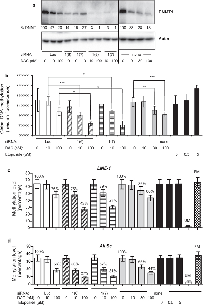 Figure 3: Effect of combining DNMT1 siRNA and DAC on global DNA methylation and on the methylation of LINE-1 and AluSc repeated sequences. (a) DNMT1 Western blot performed on KG1 cells exposed to combination of siRNA (Luc, DNMT1(6) or DNMT1(7)) and two doses of DAC (10 and 100 nM) (left), compared to DAC-treated cells at 10, 30 or 100 nM (right). The full gel images are accessible in Supplementary Figure S6. The percentages of DNMT1 protein level (% DNMT1) normalized to 100% for their respective control (siLuc for electroporated cells and non treated for DAC treatment) are indicated. The image shown is representative of two independent experiments, except for the siRNA 1(7) that was tested in duplicates in this experiment (b) 72 h post-treatment, cells were collected and total DNA methylation was measured by flow cytometry for cells treated with siRNA Luc (100 nM) alone or combined with 10 or 100 nM DAC (white bars), siRNA DNMT1(6) (100 nM) alone or combined with 10 or 100 nM DAC (hatched bars); siRNA DNMT1(7) (100 nM) alone or combined with 10 or 100 nM DAC (striped bars); DAC alone at 10, 30 and 100 nM (gray bars) or etoposide at 0.5 or 5 μM (black bars). P value: * ≤ 0.05, ** ≤ 0.01 and *** ≤ 0.001. (c–d) KG1 cells treated for 72 hours with various combinations of DNMT1 siRNA (1(6) and 1(7)) and DAC were analyzed by bisulfite conversion followed by pyrosequencing for methylation changes in LINE-1 (c) and AluSc (d). Cells were treated also with increasing concentration of etoposide. The mean methylation level of all CpG present in the sequenced DNA and the standard error are represented. The percentage of demethylation (normalized to 100% for the controls, i.e. luciferase siRNA and untreated cells) are also indicated. FM, fully methylated DNA control, and UM, unmethylated DNA control.