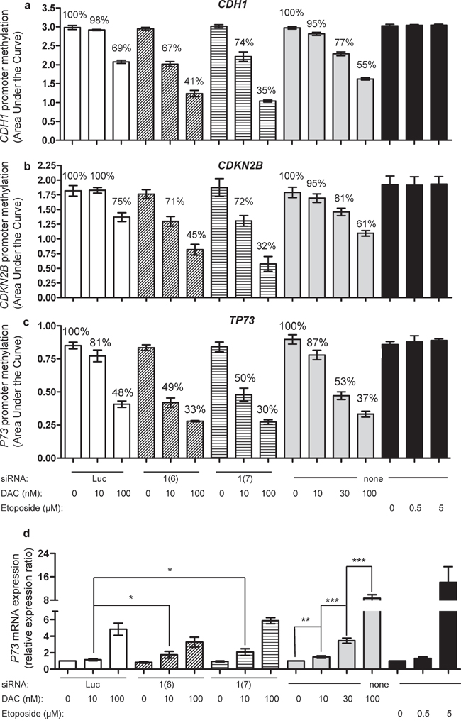 Figure 4: Impact of combining DNMT1 siRNA with DAC on promoter methylation of CDH1 and CDKN2B, and promoter methylation and expression of TP73. CDH1 (a), CDKN2B (b) and TP73 (c) methylation was measured by MS-HRM 72 h after treating the cells with DNMT siRNA Luc (100 nM, white bars), siRNA DNMT1(6) at 100 nM (hatched bars), siRNA DNMT1(7) at 100 nM (stripped bars) and in combination with DAC (10 and 100 nM) (left), compared to DAC alone at 10, 30 and 100 nM (gray bars) or etoposide at 0.5 and 5 μM (black bars) (right). The mean percentage values of methylation, relative to the respective controls are indicated. (d) qRT-PCR analysis of TP73 mRNA expression of the above treated cells. The expression ratio of the controls was normalized to 1, i.e., luciferase siRNA (for electroporated cells), water (the solvent of DAC) and DMSO (the solvent of etoposide), respectively. P value: * ≤ 0.05, ** ≤ 0.01 and *** ≤ 0.001.