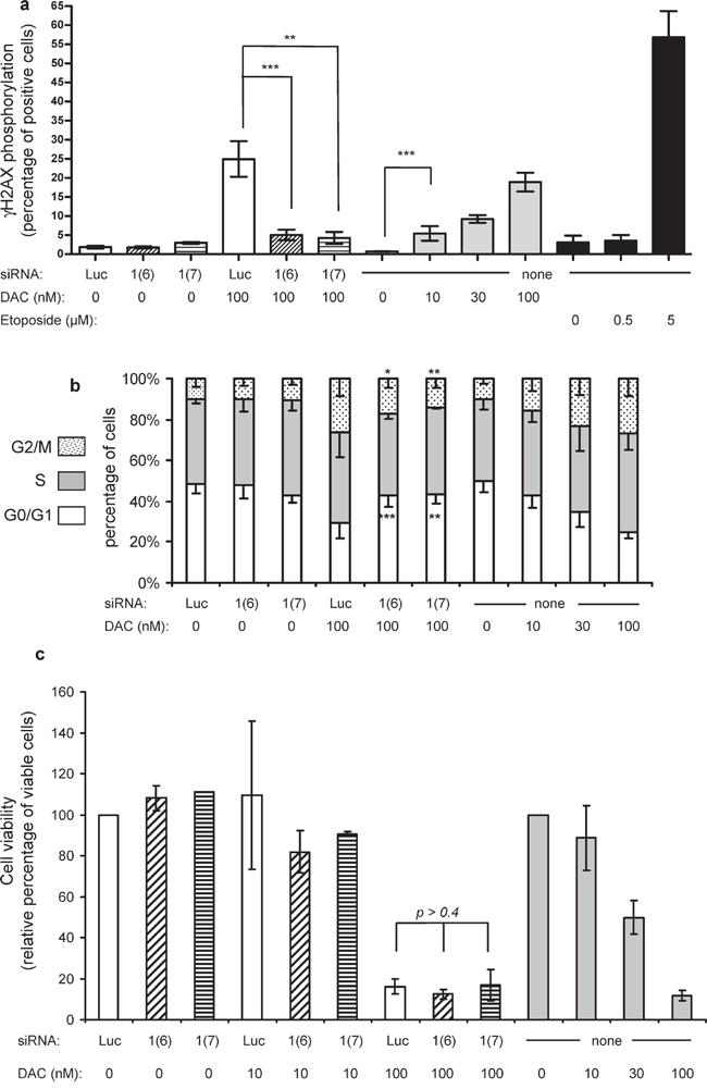 Figure 5: γH2AX phosphorylation labeling, cell cycle and cell viability analysis 72 h after treatment. (a) The percentages of positive cells for γH2AX phosphorylation are reported for siRNA at 100 nM (siLuc, white bars, siDNMT1(6) hatched bars and siDNMT1(7) stripped bars) alone or in the presence of 100 nM DAC; for DAC alone at 10, 30 and 100 nM (gray bars) or for etoposide at 0.5 and 5 μM (black bars). P-value: ** ≤ 0.01 and *** ≤ 0.001. (b) The cell cycle repartition, indicated as percentages of cells in each phase (G0/G1 lower bars, S middle bars, G2/M upper bars), is shown for the various treatments applied to the cells. The stars on the histogram refer to the p-values calculated for both G0/G1 and G2/M compartments in KG1 cells treated with 100 nM DAC combined with either DNMT1 siRNA1(6) and 1(7) versus the cells exposed to 100 nM DAC combined with the control siRNA (Luc). (c) After γH2AX phosphorylation measurement, cells from the same batch were seeded for another 4 days and cell viability assessed. The percentage of viable cells is indicated relative to their respective controls (siLuc and 0 nM DAC) set to 100% viable cells. White bars: 100 nM siLuc; hatched bars: 100 nM siDNMT1(6); stripped bars: 100 nM DNMT1(7); gray bars: DAC at 10, 30 and 100 nM.