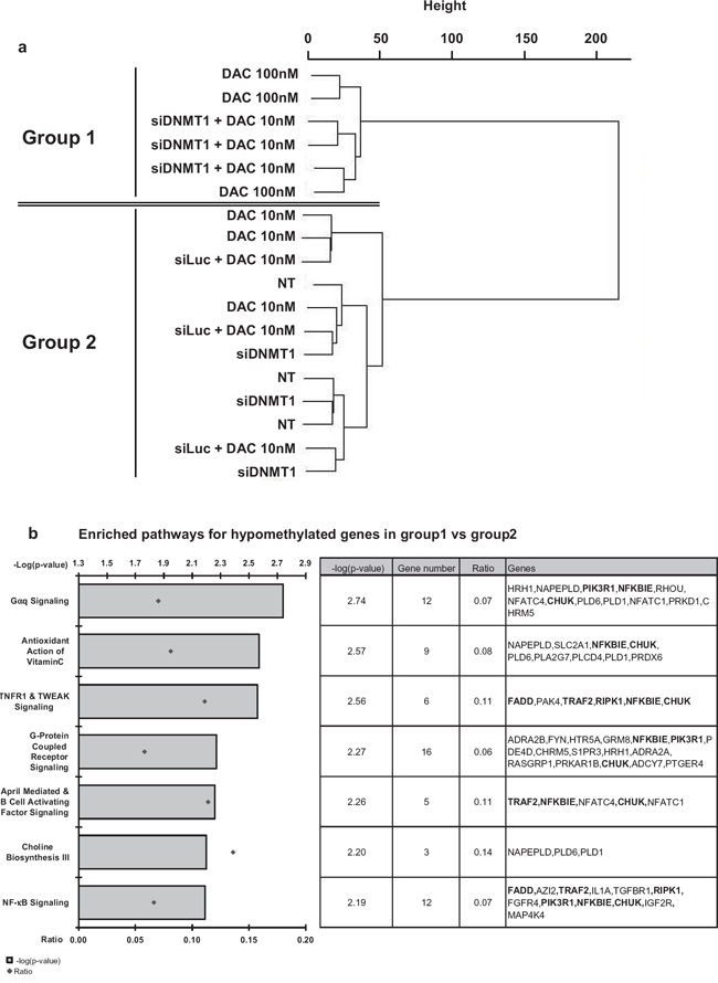 Figure 6: Genome-wide methylation analysis. The genomic DNA extracted from treated KG1 cells was analyzed on an Illumina 450K CpG microarray. (a) The clustering analysis shows two groups: group 1 corresponding to cells treated by 100 nM DAC or the combination of siDNMT1(6) and 10 nM DAC; and group 2, corresponding to non-treated cells (NT), cells treated with 10 nM DAC, the combination of siLuc and 10 nM DAC or siDNMT1 alone. Biological triplicates have been performed for each condition. (b) IPA® pathways analysis of hypomethylated genes enriched in group 1 vs. group 2. Bar plots, on the left, show the canonical pathways the most significantly represented in group 1 (threshold p-value < 0.01) and the ratio values corresponding to the proportion of deregulated genes among all genes found in each pathway. The table on the right gives a detailed view of the genes hypomethylated in each pathway. The genes involved in the NF-kB pathway are in bold.