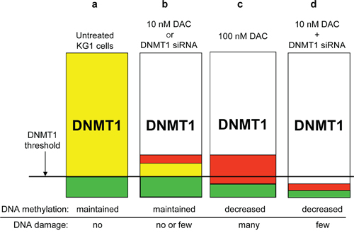 Our data show that (i) DNMT1 is the main methyltransferase involved in the maintenance of global and TSG promoter-specific (TP73, CDH1 and CDKN2B) DNA hypermethylation in KG1 cells; (ii) DNA damage formation can be dissociated from DNA demethylation activity in cells exposed to DAC; (iii) KG1 cells express DNMT1 protein at a level largely superior to the one required to ensure DNA methylation maintenance; (iv) a threshold must be bypassed in order to trigger global DNA hypomethylation and specific DNA demethylation of tumor suppressor genes, and (v) TP73 mRNA re-expression by DAC requires, in addition to demethylation of its promoter, another molecular event, potentially DNA damage.