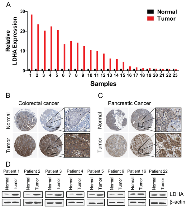 Figure 1: Expression of LDHA in human colorectal cancer and pancreatic cancer tissues. (A) RT-PCR analysis of LDHA in human colorectal cancer and adjacent normal tissues (n = 30). (B, C) Higher expression of LDHA was confirmed by immunohistochemistry in human colorectal cancer (B) and pancreatic cancer (C). (D) Western blot analysis of LDHA in eight selected human CRC and adjacent normal tissues.