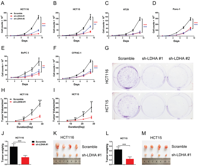 Figure 2: Knockdown of LDHA inhibits cell growth in vitro and in vivo. (A–F) Cell proliferation assay results. Twenty thousand (A, B, D) or forty thousand (C, E, F) cells stably expressing LDHA-shRNA and scramble-shRNA were plated in 6-well plates and the cells were counted every alternate day and the numbers are plotted from three independent experimental wells. (G) Colony formation assay results. Five hundred HCT116 or HCT15 cells stably expressing LDHA-shRNA or scramble-shRNA were plated in 6-well plates supplemented with 10% FBS for 2 days followed with 2% FBS for a further 12 days. Colonies were stained with crystal violet. The number of colonies was counted from three independent experimental wells. (H–M) Tumor formation assay results. 6 × 106 cells with indicated expression conditions were injected subcutaneously into 6 week-old nude mice (n = 8 mice/group). Tumors were monitored once a week. After four weeks, the mice were sacrificed, and the tumors were resected, weighed and imaged. Tumor volume, tumor weight, and tumor photos of HCT116 (H, J, K) or HCT15 (I, L, M) cells stably expressing LDHA-shRNA and scramble-shRNA were analyzed. Data represent mean ± SD. **0.001 < p < 0.01; ***p < 0.001.