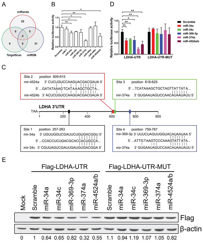 Figure 3: miR-34a, miR-34c, miR-369–3p, miR-374a, and miR-4524a/b suppress the expression of LDHA. (A) Venn diagrams showing the number of potential miRNAs target 3’ UTR of LDHA as predicted by two databases: TargetScan and miRDB. (B) Dual-luciferase assay results. Repression of LDHA by candidate miRNAs was measured as ratios of Renilla and Firefly luciferase activity in 293T cells. The luciferase activity was quantified from five independent experimental wells. (C) Sequences of indicated miRNAs and their potential binding site at the 3’ UTR of LDHA. (D) Dual-luciferase assays showing repression of wild-type UTR (LDHA-UTR) or mutant UTR (LDHA-UTR-MUT) following transfection of indicated miRNAs or scramble. (E) Western blot analysis showing LDHA levels expressed from LDHA cDNA with a wild-type UTR (Flag-LDHA-UTR) or mutant UTR (Flag-LDHA-UTR-MUT) in the presence of indicated miRNAs or scramble in 293T cells. Data represent mean ± SD. *0.01 < p < 0.05; **0.001 < p < 0.01.