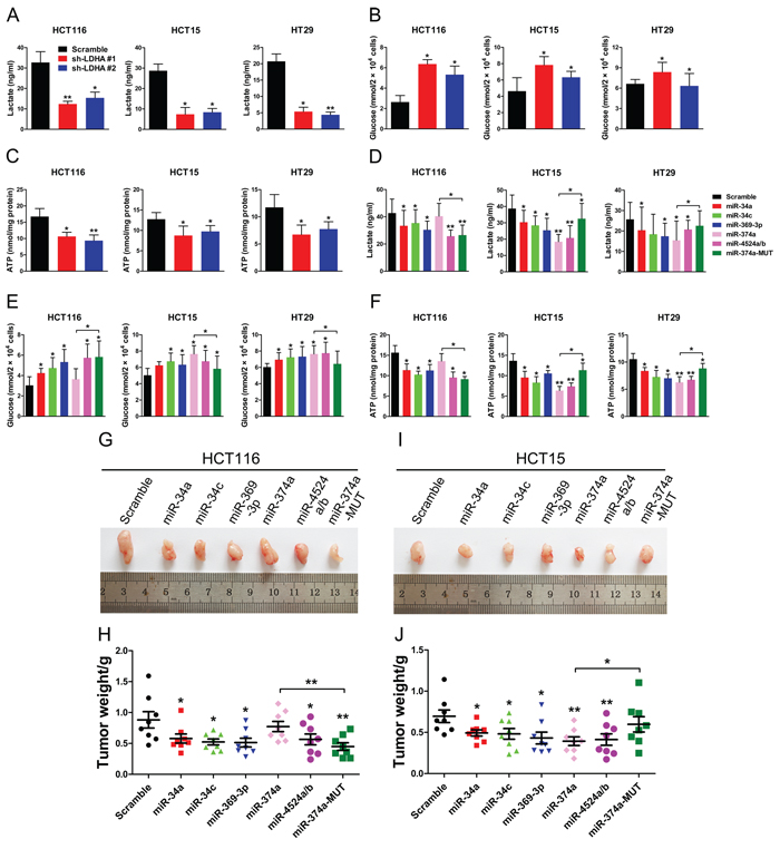 Figure 5: miR-34a, miR-34c, miR-369-3p, miR-374a, and miR-4524a/b suppress glycolysis and tumorigenesis. (A, B, C) lactate (in the culture media) (A), Glucose (in the culture media) (B), and intracellular ATP levels (B) in human CRC cell lines stably expressing LDHA-shRNA and scramble-shRNA. (D, E, F) lactate (in the culture media) (D), Glucose (in the culture media) (E), and intracellular ATP levels (F) in human CRC cell lines stably expressing indicated miRNAs or scramble cells lines. (G–J) Tumor formation assay results. 6 × 106 HCT116 or HCT15 cells with indicated expression conditions were injected subcutaneously into 6 week-old nude mice (n = 8 mice/group). After four weeks, the mice were sacrificed, and the tumors were resected, weighed and imaged. Tumor photos, and tumor weight of HCT116 (G, H) or HCT15 (I, J) cells stably expressing indicated miRNAs or scramble cells. Data represent mean ± SD. *0.01 < p < 0.05; **0.001 < p < 0.01.