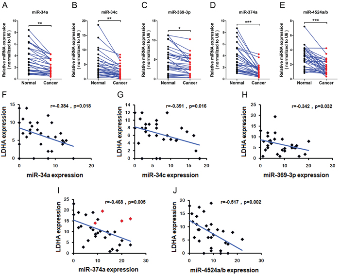 Figure 6: Expression levels of miR-34a, miR-34c, miR-369-3p, miR-374a, and miR-4524a/b with LDHA in human CRC tissues. (A–E) miR-34a (A), miR-34c (B), miR-369–3p (C), miR-374a (D), and miR-4524a/b (E) were determined by RT-PCR in human colorectal cancer and adjacent normal tissues (n = 30). *0.01 < p < 0.05; **0.001 < p < 0.01; ***p < 0.001. (F–J) Correlative analysis of the indicated miRNAs, and LDHA in human colorectal cancer tissues (n = 30). Spearman correlation coefficient with the respective significance is indicated.