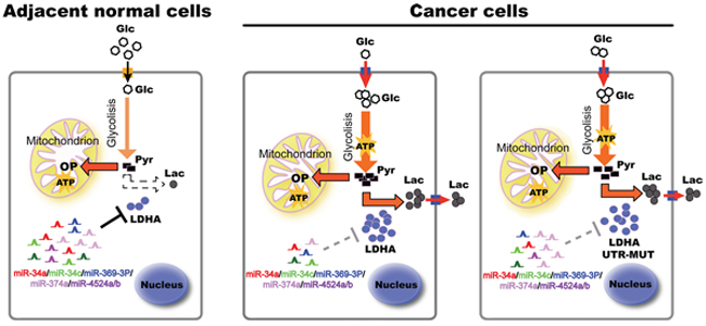 miR-34a, miR-34c, miR-369-3p, miR-374a, and miR-4524a/b suppress glycolysis through inhibition of LDHA
