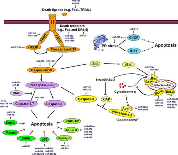 Many miRNAs have been shown to be involved in regulating the intrinsic apoptotic pathway and in inhibiting tumor growth. miR-365, which is highly expressed in invasive ductal adenocarcinoma, directly targets the adaptor protein Src homology 2 domain-containing 1 (SHC1) and the pro-apoptotic protein Bax, and these interactions are associated with gemcitabine resistance in pancreatic cancer cells [18]. miR-125b conferred the resistance of breast cancer cells to paclitaxel via the suppression of pro-apoptotic Bak expression [19]. miR-491 directly targets Bcl-xL and significantly decreases the viability of human DLD-1 colorectal cancer cells by inducing apoptosis. Treatment with miR-491 also suppresses DLD-1 cell-derived tumor growth in nude mice in vivo [20]. miR-133a was shown to be down-regulated in osteosarcoma cell lines and in primary human osteosarcoma tissues, and this down-regulation strongly correlated with tumor progression and prognosis. The restoration of miR-133a inhibited cell proliferation, induced apoptosis, and suppressed tumorigenicity in osteosarcoma cell lines. The tumor-suppressive activity of miR-133a is likely due to the targeted suppression of Bcl-xL and Mcl-1 expression [21]. miR-608 was also reported to target Bcl-xL to regulate chordoma malignancy [22]. miR-15a and miR-16–1 were shown to be frequently deleted or down-regulated in a majority of chronic lymphocytic leukemia (CLL) cases, and their expression inversely correlated with Bcl-2 expression. A further study showed that these two miRNAs negatively regulate Bcl-2 at the posttranscriptional level via direct inhibition [23] and induce apoptosis. miR-204 is another suppressor of Bcl-2 expression. The down-regulation of miR-204 correlated with increased Bcl-2 protein staining in human gastric cancer (GC) specimens. The ectopic expression of miR-204 inhibited colony formation, cell migration and tumor engraftment by GC cells and increased the responsiveness of GC cells to 5-fluorouracil or oxaliplatin treatment [24]. miR-148a and miR-24–2c also directly suppress Bcl-2 expression [25, 26]. miR-23a/b and miR-27a/b act as endogenous inhibitors of Apaf-1 expression and control the sensitivity of neurons to apoptosis [27]. miR-133 and miR-24a were observed to directly repress caspase-9 to regulate cell fate (Figure 1) [28, 29].