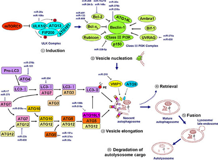 Figure 2: miRNAs regulate the major cascades of autophagy. Autophagy includes at least six successive events: induction, vesicle nucleation (or phagophore formation), vesicle elongation and autophagosome formation, ATG protein and lipid retrieval, fusion of the autophagosome to an lysosome/endosome and autolysosome formation, and autolysosome cargo degradation. The ULK complex, which is composed of ULK1/2, ATG13, FIP200, and ATG101, is activated by the inhibition of mTORC1 and initiates the autophagy program. The class III PI3K complex, which is composed of Beclin-1, class III PI3K (i.e., Vps34), p150 (i.e., Vps15), ATG14L, and certain regulatory factors, is essential for vesicle nucleation. Two ubiquitin-like protein conjugation systems form two important complexes (the LC3-II-PE complex and the ATG5-ATG12-ATG16L1 complex) that are critical for vesicle elongation. The transmembrane proteins VMP1 and ATG9 also play a role in nascent autophagosome formation. The major miRNAs involved in the regulation of key members of autophagy cascades are shown in the diagram in dark blue. mTORC1, mammalian target of rapamycin complex 1; ULK, UNC-51-like kinase; ATG, autophagy-related gene; FIP200, focal adhesion kinase family-interacting protein of 200 kDa; UVRAG, UV radiation resistance-associated gene; Rubicon, RUN domain protein as Beclin-1 interacting and cysteine-rich containing; PE, phosphatidylethanolamine; VMP1, vacuole membrane protein 1; PI3K, phosphatidylinositol-3 kinase. Pro-LC3, primary translation product of LC3; LC3-I, cytosolic form of LC3 that is cleaved from Pro-LC3 by ATG4; LC3-II, lipidated form of LC3 that is conjugated to PE. See the text for details.