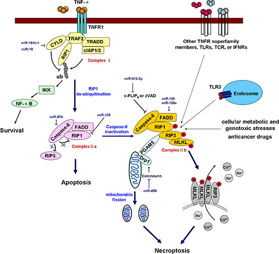 Figure 4: miRNAs regulate necroptosis. Necroptosis is triggered by TNF receptor superfamily members, TLRs, IFNRs, TCR, cellular metabolic and genotoxic stresses, and anticancer drugs. In TNF-α-induced necroptosis, the engagement of TNFR1 recruits Complex I (composed of TRADD, RIP1, TRAF2, CYLD, and cIAP1/2). In this complex, cIAP1 and cIAP2 ubiquitinate RIP1, whereas CYLD deubiquitinates RIP1. Polyubiquitinated RIP1 promotes NF-κB activation and prevents the formation of Complex II a (composed of caspase-8, FADD, RIP1) and Complex II b (composed of caspase-8, FADD, RIP1, RIP3, and MLKL), thus promoting cell survival and inhibiting apoptosis and necroptosis. RIP1 deubiquitination enables Complex II a formation, but whether the cell undergoes necroptosis is dependent on caspase-8 activity. Activated caspase-8 cleaves RIP1 and RIP3 and blocks necroptosis. However, if caspase-8 is inactivated by a pharmacological inhibitor (e.g., zVAD), an endogenous inhibitor (e.g., c-FLIPS) or genetic caspase-8 or FADD inhibition/deletion, it loses the capacity to cleave RIP1 and RIP3, leading to the trans-phosphorylation of these two kinases and the formation of a filamentous-like complex termed the necrosome. The RIP1-RIP3 necrosome subsequently recruits and activates MLKL and PGAM5. MLKL is phosphorylated by RIP3 and then forms a homotrimer that translocates to the plasma membrane, and this event leads to necrotic plasma membrane permeabilization. Upon necrosis induction, PGAM5S recruits and activates Drp1, which leads to mitochondrial fission, which is an early and necessary step for necrosis execution. The miRNAs involved in the regulation of key components of the necroptotic pathway are shown in the diagram in dark blue. TLRs, Toll-like receptors; TCR, T-cell receptor; IFNRs, interferon receptors; TNFR1, TNF-α receptor 1; TRADD, TNFR1-associated death domain protein; TRAF2, TNF receptor-associated factor 2; CYLD, cylindromatosis; cIAP1/2, cellular inhibitor of apoptosis 1/2; RIP1, receptor-interacting protein kinase 1, also referred to as RIPK1; IKK, IκB kinase; c-FLIPS, cellular FLICE-like inhibitory protein, short form. PGAM5, phosphoglycerate mutase 5; MLKL, mixed lineage kinase domain-like; Drp1, dynamin-related protein 1.