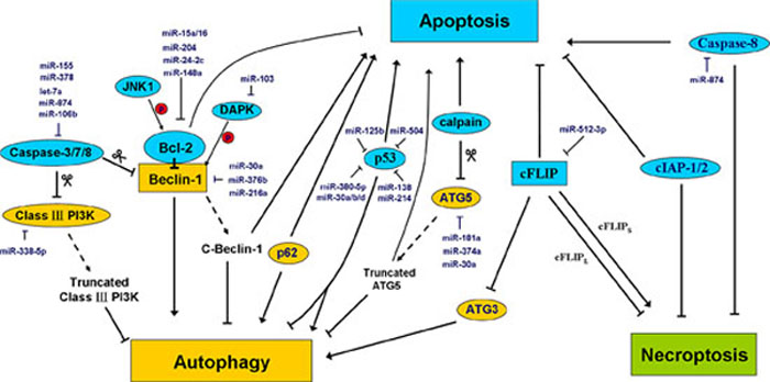 (2) One miRNA may target more than one component of a death pathway and even more than one death pathway. For example, miR-30a targets Beclin-1, ATG5, and p53; miR-155 regulates FADD, caspase-3, Rheb, and RIPK1. It is necessary to understand the crosstalk between these different regulatory activities and the strength of each regulatory effect.